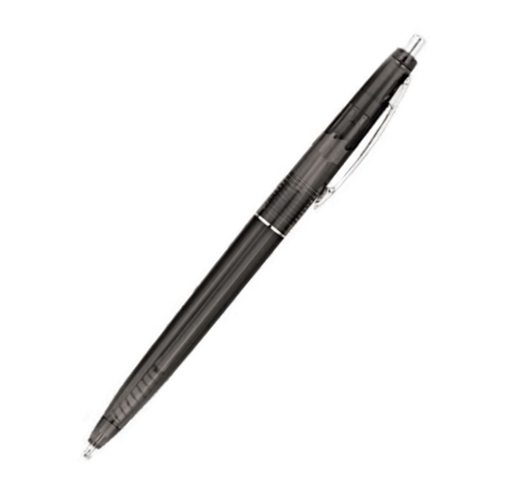 )Автоматична кулькова ручка з міцного напівпрозорого пластика чорного та інших яскравих кольорів. Модель обтічної форми з приємною матовою поверхнею, з ручним натискним механізмом і металевим кліпом на корпусі.