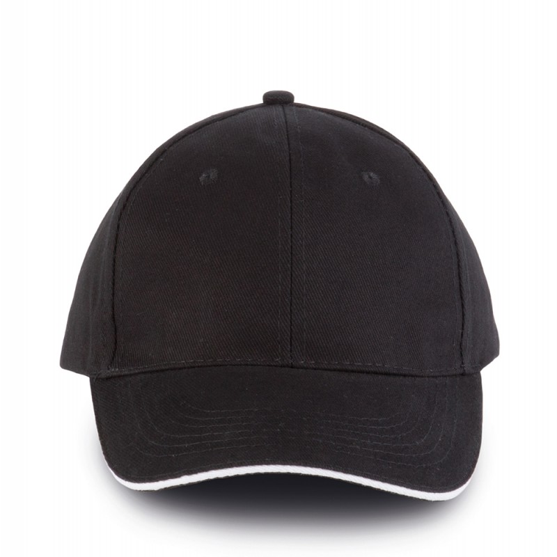 )Зручна, естетична кепка з 6 панелей із контрастним козирком типу «сендвіч». Застібка регулюється металевою пряжкою з петлею. Має 6 отворів із вишивкою для вентиляції. Матеріал: 100% щільна бавовна з начосом. Міцне та зносостійке плетіння.