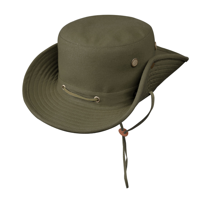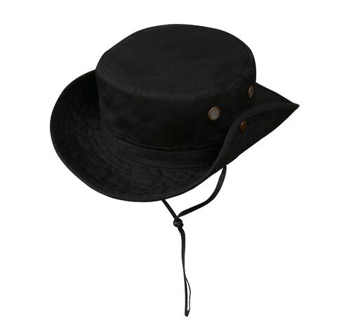 )Панама з 100 % бавовни, яка швидко сохне, дихає. Широкі поля захищають від сонця та дощу. Капелюх оснащений чотирма вентиляційними отворами. Він також має регульований по довжині шнур для кріплення під шиєю. Зручні бокові кнопки для фіксації полів. Розмір – 59.