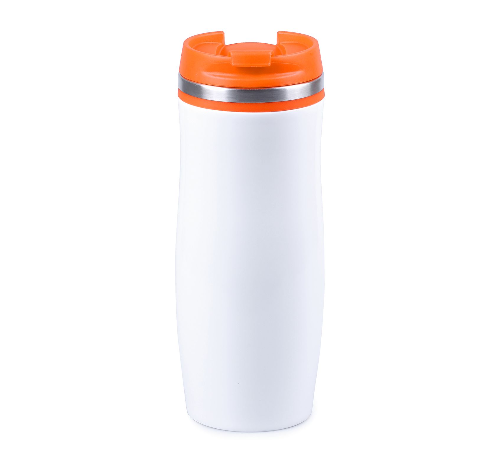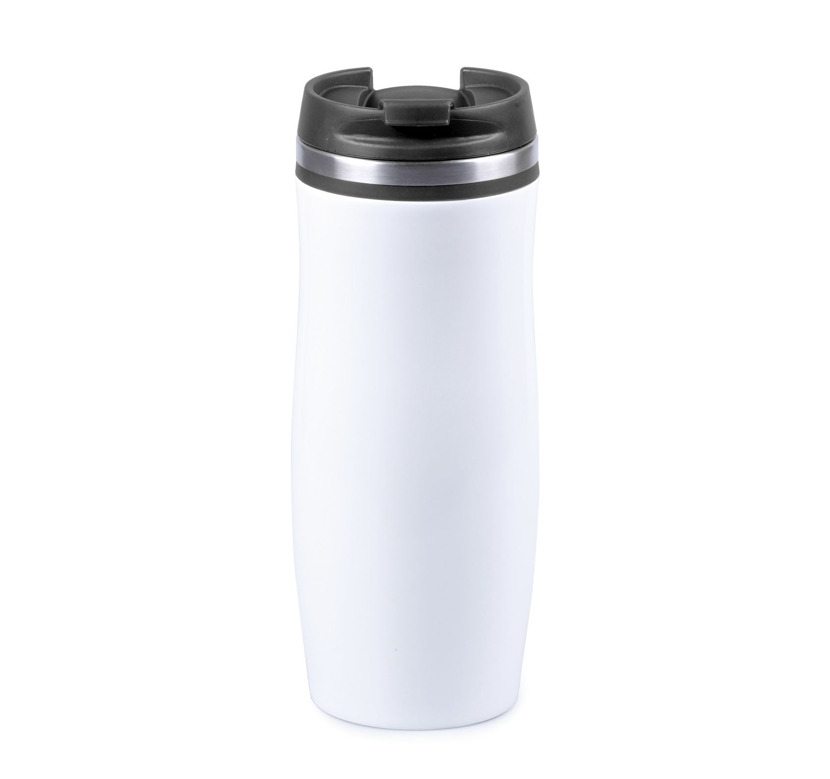 )Термокружка з подвійною стінкою з нержавіючої сталі, покрита емаллю. Кришка – пластикова з силіконовою вставкою.